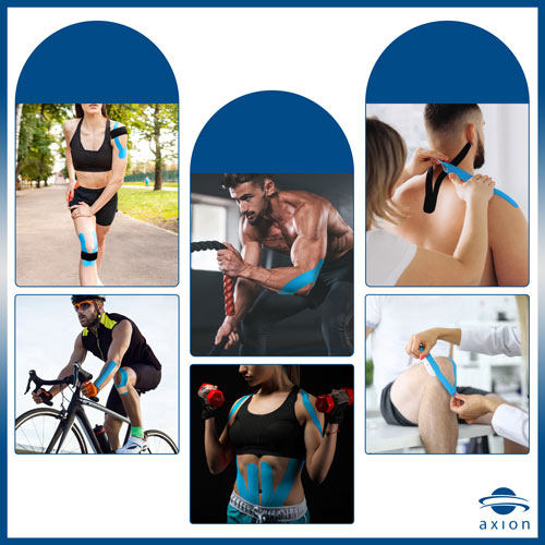 Die Anwendung an verschiedenen Körperstellen erfordert oftmals eine unterschiedliche Schnittform der Tapes, wie z.B. das Y-Tape, das X-Tape, das I-Tape oder das Oktopus-Tape (von links nach rechts). Diese und viele weitere Zuschnitte sind mit den axion Tapes ganz einfach